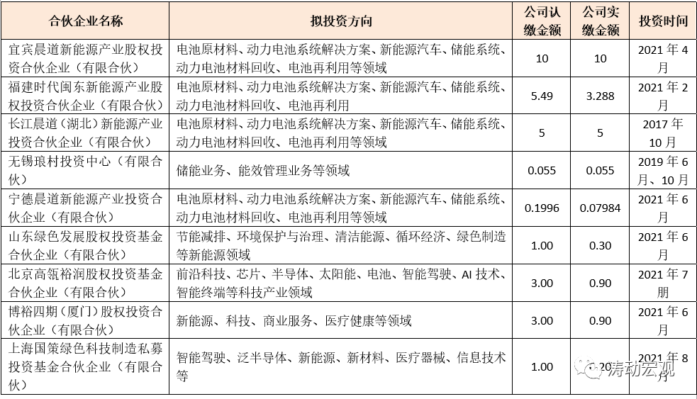 2、此外,2021年10月11日,寧德時代發(fā)布公告稱,通過受讓以及參與新設(shè)的方式投資珠海隱山現(xiàn)代物流產(chǎn)業(yè)股權(quán)投資基金(有限合伙)、青島隱山創(chuàng)業(yè)投資基金合伙企業(yè)(有限合伙)以及廈門隱山股權(quán)投資合伙企業(yè)(有限合伙),認繳金額分別為0.60億元、2億元及3億元。