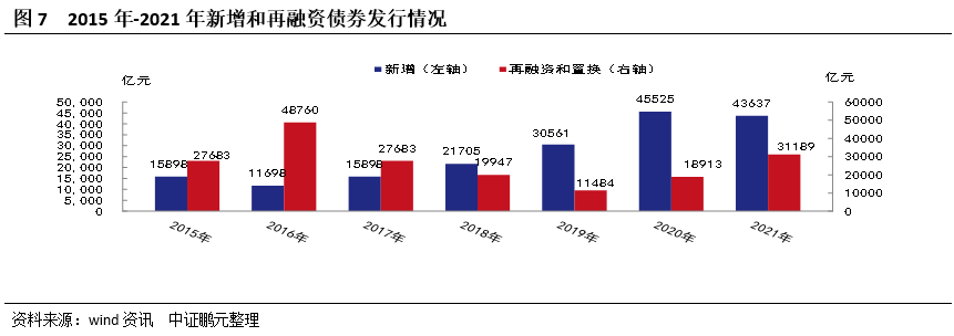 2021年,新增債券共發(fā)行1,544只,同比增長(zhǎng)0.32%,占地方債發(fā)行之比為77.5%,發(fā)行規(guī)模為43,637.09億元,同比下降4.15%,占地方債發(fā)行之比為41.7%。其中,新增一般債券發(fā)行164只,規(guī)模7,832.46億元,去年新增一般債券限額8,200億元,已發(fā)行占比95.52%。新增專項(xiàng)債券發(fā)行1,380只,規(guī)模35,804.64 億元,去年新增專項(xiàng)債券限額36,500億元,已發(fā)行占比98.09%。2021年經(jīng)全國(guó)人大批準(zhǔn),預(yù)算安排新增地方政府債務(wù)限額44,700億元,到年底新增債券規(guī)模還剩1,062.91億元。再融資債券共發(fā)行447只,同比增長(zhǎng)44.66%,占地方債發(fā)行之比為22.5%,發(fā)行規(guī)模為31,189.21億元,同比增長(zhǎng)64.91%,占地方債發(fā)行之比為58.3%。2021年下半年,為了應(yīng)對(duì)經(jīng)濟(jì)下行態(tài)勢(shì),新增債券發(fā)行明顯提速,新增債券發(fā)行出現(xiàn)大幅上升。下半年,新增債券共發(fā)行1,117只,同比增長(zhǎng)81.04%,發(fā)行規(guī)模為28,837.29億元,同比上升63.33%。