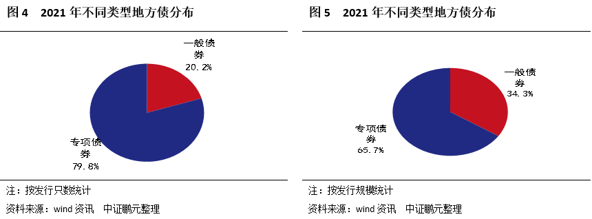 2021年一般債券和專項(xiàng)債券發(fā)行均出現(xiàn)大幅擴(kuò)張。一般債券方面,上半年發(fā)行規(guī)模上升,下半年出現(xiàn)下降。專項(xiàng)債券方面,上半年由于監(jiān)管層對(duì)專項(xiàng)債項(xiàng)目審核趨嚴(yán),發(fā)行出現(xiàn)萎縮,但下半年為了應(yīng)對(duì)經(jīng)濟(jì)下滑局面,專項(xiàng)債券發(fā)行出現(xiàn)大幅擴(kuò)張。具體來(lái)看,2021年,地方債一般債券共發(fā)行403只,同比上升23.24%,占全年地方債發(fā)行之比為20.2%,發(fā)行規(guī)模25,636.18億元,同比上升11.30%,占比34.3%;專項(xiàng)債券1,588只,同比上升4.40%,占比79.8%,發(fā)行規(guī)模49,190.13億元,同比上升18.80%,占比65.7%。2021年下半年,地方債一般債券共發(fā)行214只,同比上升15.68%,發(fā)行規(guī)模9,532.93億元,同比下降19.86%;專項(xiàng)債券1,122只,同比上升74.49%,發(fā)行規(guī)模31,881.93億元,同比上升80.34%。