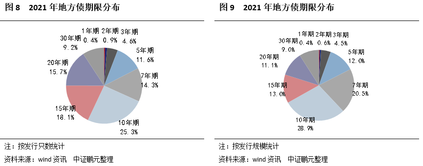 2021年,長(zhǎng)期限債券發(fā)行下降,地方債發(fā)行期限有所縮短。具體來(lái)看,2021年,10年期以上地方債(含10年期)發(fā)行只數(shù)和發(fā)行規(guī)模占地方債發(fā)行之比分別為68.3%和62%,而2020年10年以上長(zhǎng)期限債券(包括10年期)發(fā)行只數(shù)和發(fā)行規(guī)模則分別占比77.5%和76.6%,但下半年10年以上長(zhǎng)期限債券發(fā)行只數(shù)和規(guī)模均有所上升,占比分別為70.96%和66.13%。2021年地方債平均期限為12.89年,比2020全年縮短1.53年。