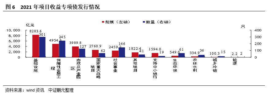 項(xiàng)目收益專項(xiàng)債方面,2021年共發(fā)行1,055只,規(guī)模26,850.72億元,分別同比減少9.8%和10.6%。從種類來(lái)看,發(fā)行規(guī)模居前三位的項(xiàng)目類型為基礎(chǔ)設(shè)施建設(shè)、保障性安居工程和市政及產(chǎn)業(yè)園區(qū),分別為8,283.65億元、4,954.31億元、3,989.85億元,發(fā)行只數(shù)居前三位的類型分別為基礎(chǔ)設(shè)施建設(shè)、保障性安居工程、社會(huì)事業(yè),分別為301只、245只、146只。2021年項(xiàng)目收益專項(xiàng)債中支持中小銀行專項(xiàng)債券發(fā)行提速,2020年僅發(fā)行506億元,到2021年發(fā)行了1,594億元,上升了近3倍,并且2,000億元額度已全部用完,規(guī)模略有超過(guò),應(yīng)為遼寧多發(fā)行了100億元所致。