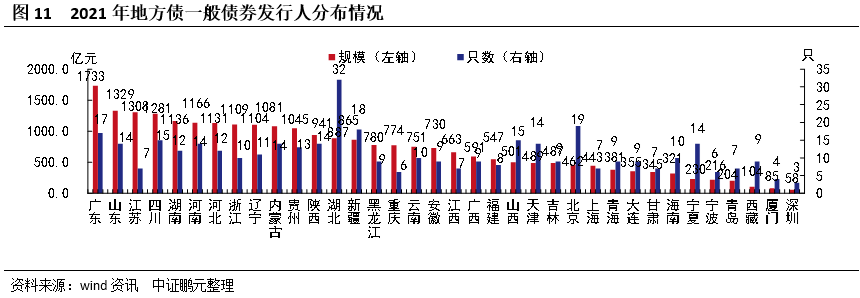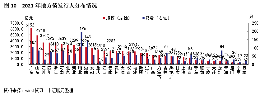 2021年,31個(gè)省份、5個(gè)計(jì)劃單列市均發(fā)行了地方債。地區(qū)分布方面,廣東、山東這些東部發(fā)達(dá)地區(qū)發(fā)行靠前,中部地區(qū)河南比較靠前,西部地區(qū)四川較為突出。具體來(lái)看,規(guī)模方面,廣東發(fā)行規(guī)模最大,共發(fā)行6,151.76億元,其次為山東,發(fā)行4,910.16億元,再者為江蘇,發(fā)行3,701.85億元。西藏、寧夏等西部地區(qū)發(fā)行相對(duì)靠后,分別發(fā)行162.31億元、259.42億元,位居倒數(shù)第一位和第二位。發(fā)行數(shù)量方面,湖北發(fā)行數(shù)量最多,共發(fā)行了196只,其次為湖南,發(fā)行了143只,再者為廣東,發(fā)行了107只,寧夏和新疆分別發(fā)行12只和17只,位居倒數(shù)第一位和第二位。另外,四川和河南分別位居發(fā)行規(guī)模的第四位和第六位,相對(duì)靠前。