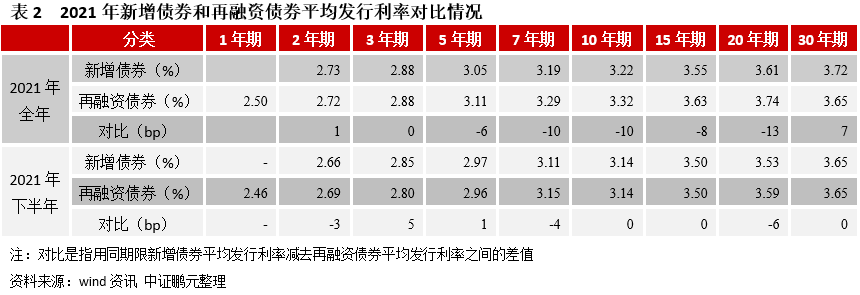 3、同期限新增債券平均發(fā)行利率整體低于再融資債券。2021年,除2年期和30年期,新增債券平均發(fā)行利率整體低于再融資債券。具體來(lái)看,2年期和30年期新增債券平均發(fā)行利率高于同期限再融資債券1BP和7BP,3年期持平,5年期、7年期、10年期、15年期和20年期新增債券平均發(fā)行利率低于同期限再融資債券,分別低于6BP、10BP、10BP、8BP、13BP。但下半年同期限新增債券平均發(fā)行利率與再融資債券相比有高有低,其中,3年期、5年期新增債券平均發(fā)行利率高于同期限再融資債券,分別高于5BP和1BP,2年期、7年期和20年期新增債券平均發(fā)行利率低于同期限再融資債券,分別低于3BP、4BP、6BP。