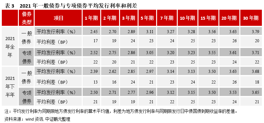 4、同期限一般債券平均發(fā)行利率整體高于專項(xiàng)債券。2021年,除1年期和2年期外,同期限一般債券平均發(fā)行利率整體高于專項(xiàng)債券。具體來(lái)看,1年期、2年期、3年期、5年期、7年期、10年期、15年期、20年期和30年期一般債券平均發(fā)行利率分別為2.45%、2.70%、2.89%、3.11%、3.27%、3.28%、3.56%、3.63%和3.79%,平均利差分別為17BP、19BP、24BP、23BP、24BP、25BP、23BP、26BP和20BP。專項(xiàng)債券1年期、2年期、3年期、5年期、7年期、10年期、15年期、20年期和30年期平均發(fā)行利率分別為2.52%、2.75%、2.86%、3.05%、3.20%、3.23%、3.55%、3.61%和3.71%,平均利差分別為22BP、20BP、21BP、22BP、23BP、25BP、23BP、24BP和22BP。