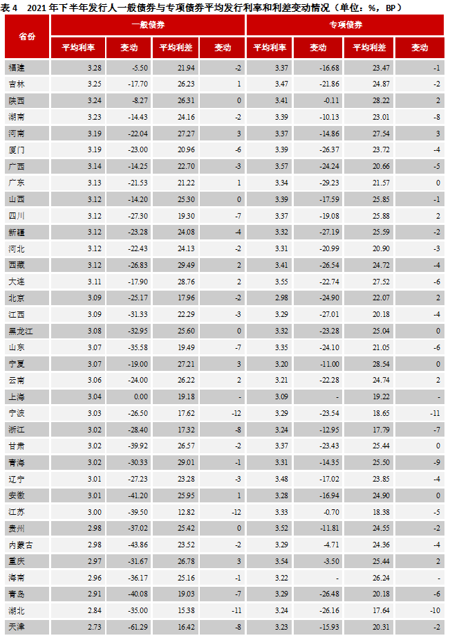 5、一般債券和專項(xiàng)債券平均發(fā)行利率整體下行,發(fā)行利差以下行為主。2021年下半年,地方債一般債券發(fā)行人平均發(fā)行利率最高的為福建,為3.28%,其次為吉林,為3.25%,再者為陜西,為3.24%;平均發(fā)行利率最低的為深圳,為2.66%,其次天津,為2.73%,再者湖北,為2.84%。地方債專項(xiàng)債券發(fā)行人平均發(fā)行利率最高的為廣西,為3.57%,其次為大連,為3.55%,再者為重慶,為3.54%;平均發(fā)行利率最低的為北京,為2.98%,其次上海,為3.09%,再者寧夏,為3.20%。2021年下半年,地方債一般債券發(fā)行人平均利差最高的為西藏,為29.49BP,其次為青海,為29.01BP再者大連,為28.76BP,最低的為江蘇,為12.82BP,其次湖北,為15.38BP,再者天津,為16.42BP;專項(xiàng)債券平均利差最高的為寧夏,為28.54BP,其次陜西,為28.22BP,再者為河南,為27.54BP,最低的為湖北,為17.64BP,其次浙江,為17.79BP,再者江蘇,為18.38BP。2021年下半年,深圳、北京等地經(jīng)濟(jì)財(cái)政實(shí)力較強(qiáng),發(fā)行利率仍然較低,湖北由于經(jīng)濟(jì)財(cái)政增速較好,發(fā)行利率也相對(duì)較低,而廣西等地由于下半年公共財(cái)政收入增速較低,發(fā)行利率相對(duì)較高。