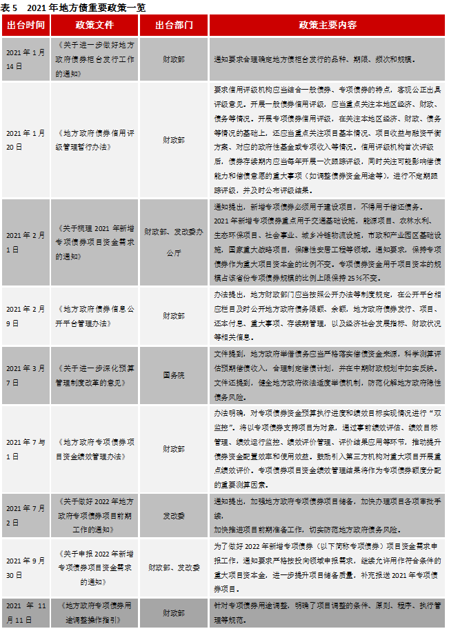 2021年地方政府相關(guān)政策主要有兩條主線,一是繼續(xù)加強(qiáng)對(duì)地方債的管理,包括從柜臺(tái)發(fā)行、信用評(píng)級(jí)、信息公開(kāi)等方面加強(qiáng)管理,二是加強(qiáng)對(duì)專項(xiàng)債券的監(jiān)管成為一項(xiàng)重要的政策內(nèi)容,比如上半年出臺(tái)的《關(guān)于梳理2021年新增專項(xiàng)債券項(xiàng)目資金需求的通知》,對(duì)專項(xiàng)債券資金投向和審核條件作了進(jìn)一步的明確要求。下半年,地方政府債券相關(guān)政策主要集中在專項(xiàng)債券領(lǐng)域,包括兩方面,一是完善專項(xiàng)債券管理,文件主要包括《地方政府專項(xiàng)債券項(xiàng)目資金績(jī)效管理辦法》和《地方政府專項(xiàng)債券用途調(diào)整操作指引》,前者主要內(nèi)容是對(duì)專項(xiàng)債券項(xiàng)目實(shí)施績(jī)效管理,通過(guò)事前績(jī)效評(píng)估、績(jī)效目標(biāo)管理、績(jī)效運(yùn)行監(jiān)控、績(jī)效評(píng)價(jià)管理、評(píng)價(jià)結(jié)果應(yīng)用等環(huán)節(jié),推動(dòng)提升債券資金配置效率和使用效益,后者主要內(nèi)容是針對(duì)專項(xiàng)債券資金用途調(diào)整作出了相關(guān)規(guī)定。二是推進(jìn)做好2022年地方政府專項(xiàng)債券項(xiàng)目前期工作,文件主要包括《關(guān)于做好2022年地方政府專項(xiàng)債券項(xiàng)目前期工作的通知》和《關(guān)于申報(bào)2022年新增專項(xiàng)債券項(xiàng)目資金需求的通知》,前者主要內(nèi)容是加強(qiáng)地方政府專項(xiàng)債券項(xiàng)目?jī)?chǔ)備,加快辦理項(xiàng)目各項(xiàng)審批手續(xù),加快推進(jìn)項(xiàng)目前期準(zhǔn)備工作,后者主要內(nèi)容是針對(duì)2022年新增專項(xiàng)債券項(xiàng)目資金需求申報(bào)工作,要求嚴(yán)格按投向領(lǐng)域申報(bào)需求,繼續(xù)允許用作符合條件的重大項(xiàng)目資本金,進(jìn)一步提升項(xiàng)目?jī)?chǔ)備質(zhì)量。