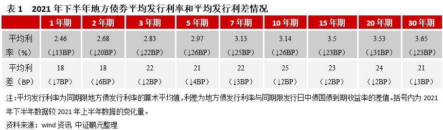 1、發(fā)行利率整體下行。2021年下半年地方債平均發(fā)行利率為3.29%,較2021年上半年下行超過(guò)19BP,主要是市場(chǎng)利率整體下行因素的影響。具體來(lái)看,1年期為2.46%,下行13BP;2年期為2.68%,下行20BP;3年期為2.83%,下行22BP;5年期為2.97%,下行26BP;7年期為3.13%,下行25BP;10年期為3.14%,下行26BP;15年期為3.5%,下行23BP;20年期為2.53%,下行31BP;30年期為3.65%,下行23BP。