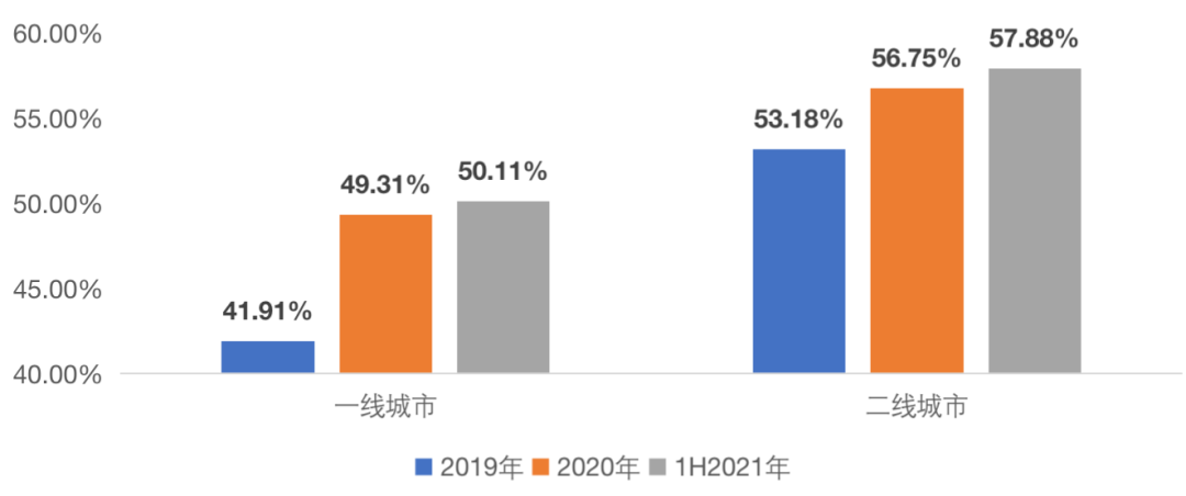二線城市改善性需求堅挺,三房、四房成交比重仍保持較快增長。2021年上半年,二線城市三房戶型成交占比升至57.88%,較2020年再增1.33個PTS,四房戶型成交占比達到20.26%,較2020年再增1.49個PTS。