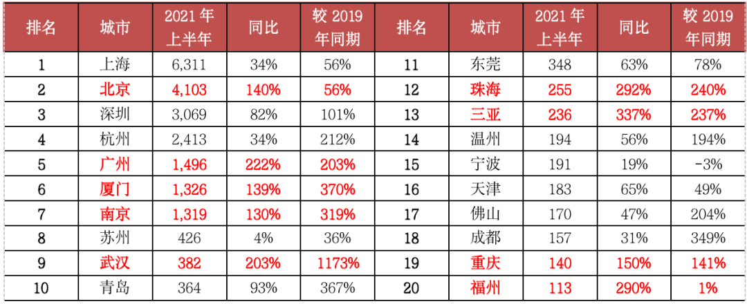 表:2021年上半年單價10萬元/平方米以上豪宅成交套數TOP20城市(單位:套)