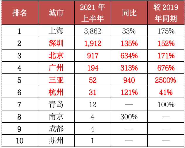 其次分別為深圳、北京和廣州,頂豪市場持續火爆,成交皆創同期新高。例如深圳,2021年上半年單價10萬元/平方米以上頂豪月均成交套數都在300套以上,累計成交達到1912套,同比增長135%,較2019年同期增長152%。