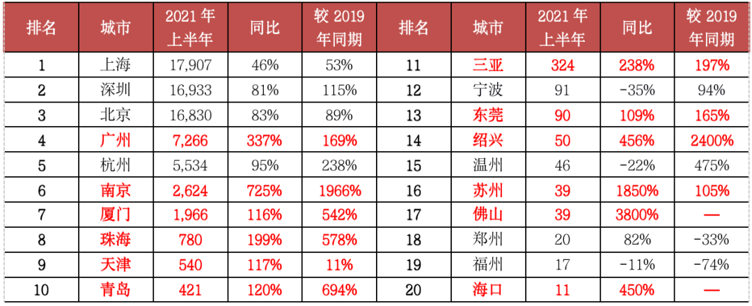 廣州、杭州、南京等多城頂豪市場轉暖,2021年上半年總價3000萬元以上頂豪成交明顯放量,同比均實現翻倍增長。