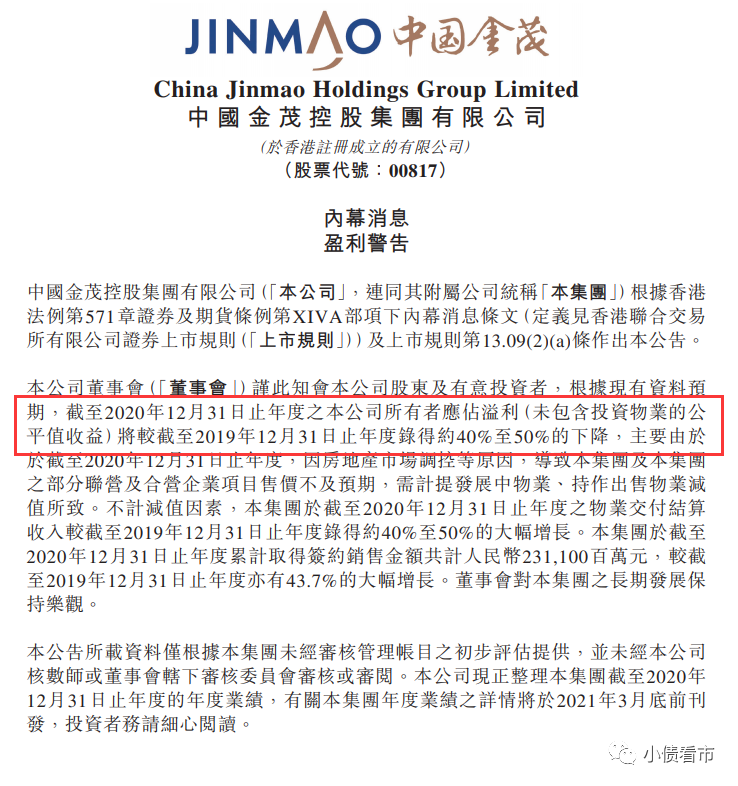 近日,中國金茂 (HK:00817)公告稱,因受房地產(chǎn)市場調(diào)控等因素影響,部分聯(lián)營及合營企業(yè)項(xiàng)目售價(jià)不及預(yù)期,截至2020年末公司所有者應(yīng)占溢利同比下降約40%-50%。