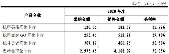 招股書顯示,2020年度華立科技賣出了4168.02萬人民幣的奧特曼卡片,毛利率高達30%,占總類目的63.24%。相比之下,龍珠卡、機甲變身Go卡、機斗勇者卡、寶可夢卡、機甲英雄卡等其他IP的卡片分別賣出630.22萬、512.21萬、406.25萬、391.27萬和182.59萬元,僅僅是奧特曼卡片的十分之一乃至零頭。