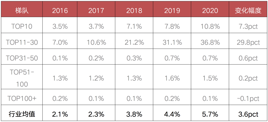 表:2016-2020年不同規模梯隊房企的