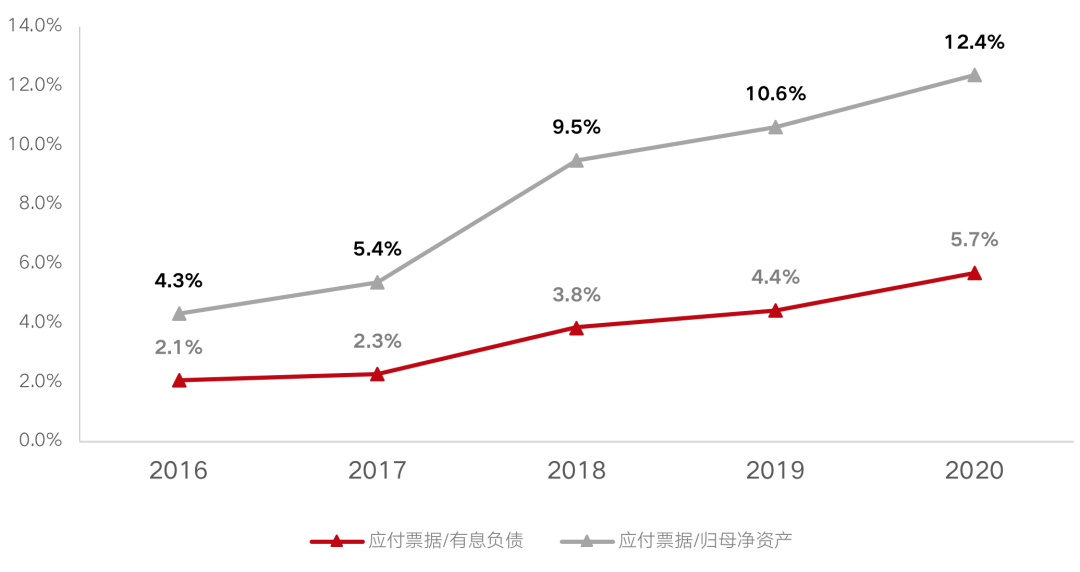 應付票據/有息負債以及應付票據/歸母凈資產(單位:%)