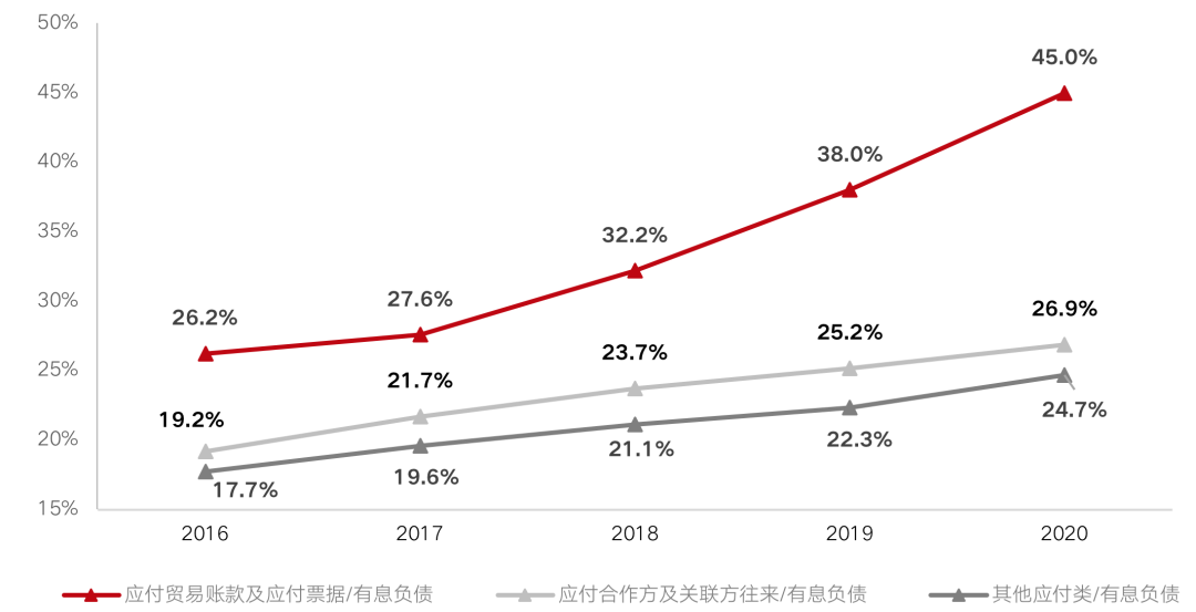 在三項應付類債務中,應付貿易賬款及票據近年來增速最為明顯,從2016年的26.2%快速攀升至2020年45%。得益于產業鏈上得天獨厚的話語權優勢,房企無償占用供應鏈資金的現象嚴重,其中八成是無息的應收賬款,帶息的應付票據規模有限,而合作方及關聯方應付類往來款項和其他類應付款項占有息負債25%上下。