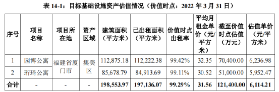 根據(jù)國融興華出具的初始評估報(bào)告,截至2022年3月31日,投資性房地產(chǎn)資產(chǎn)組價(jià)值為70,400.00萬元和51,000.00萬元,合計(jì)為121,400.00萬元,折合單價(jià)分別為6,237元/平方米和5,952元/平方米。