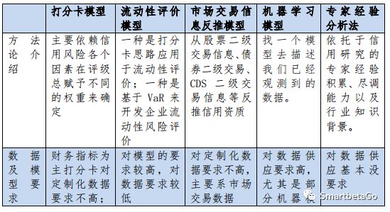 目前市場上提供的信用研究方式,筆者將其歸為五類:第一類,也是主流的是依托于專家經驗的分析法。第二類是以信用風險排序為目的模型(如打分卡模型);第三類是以評價企業財務狀況為目的財務模型,尤其是測算獲取現金能力和短期風險承受能力的流動性評價模型(如CreditVaR模型);第四類是通過市場交易信息,量化估算企業違約可能性的模型(如KMV模型,隱含違約率模型,CDS隱含違約率模型等)、第五類是把機器學習應用于信用評估的模型。