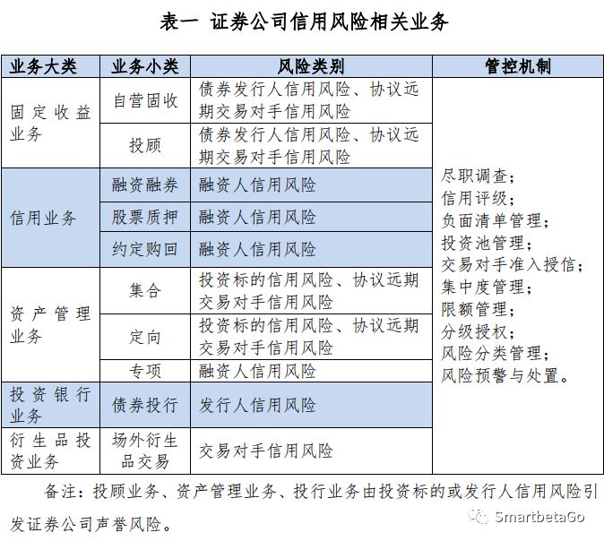 證券公司涉及到信用風險的業務條線較多,如下表一所示: