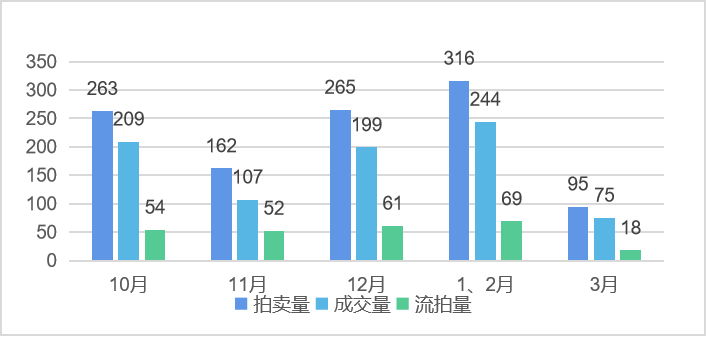 近半年拍賣金額和成交金額最高都在12月,最低在3月。成交率最高在10月,最低在11月。近半年來成交率穩步上升升,10月、11月出現較大波動考慮因上拍量突然下降市場溫度降低,近三月成交率相對平穩市場狀態良好。