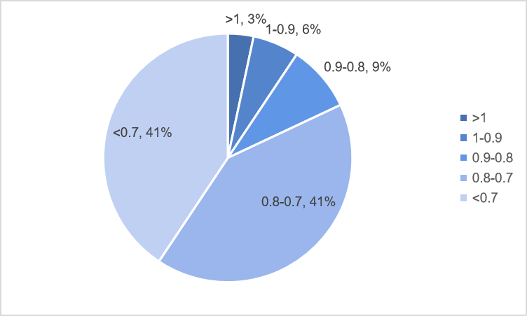 根據數據統計,150套房屋平均折扣率為0.73,大于等于1的套數為5套,小于1大于等于0.9為9套,小于0.9大于等于0.8套數為13套,小于0.8大于等于0.7套數為62套,小于0.7的套數為61套。