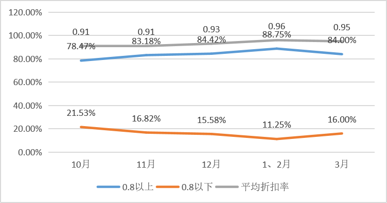 近半年成交市價比在0.8以下的占比最高的是10月,最低的是1、2月。平均折扣率最高的是在1、2月,為96折,3月平均折扣率依然很高與1、2月持平。