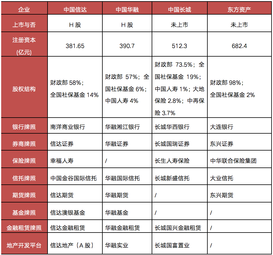 全國性AMC由財政部直接控股,資金實力雄厚(注冊資本大),不良資產管理的經營范圍為全國性,主要參與一級市場。發展到現在,全國性AMC擁有AMC、銀行、證券、保險、基金、金融租賃等多元業務,逐步轉變為全牌照的金融控股集團,同時還廣泛涉足私募基金、房地產開發等業務,地產業務平臺上,除東方資產外,中國信達、中國華融和中國長城旗下均設立房地產開發平臺。