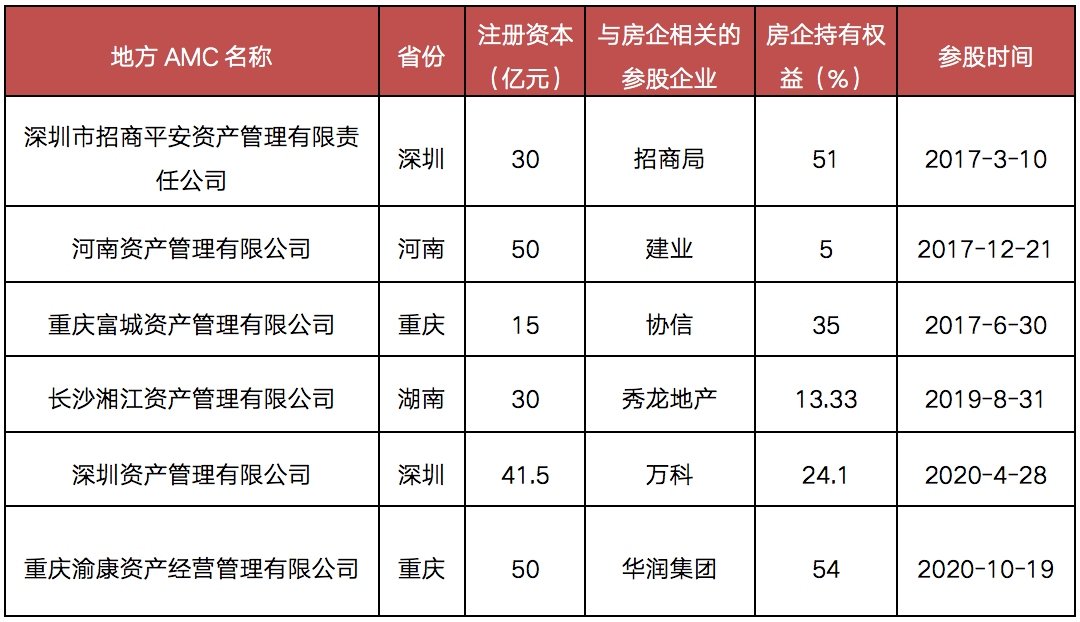 在此背景下,房企爭相參股地方資產管理公司(AMC),承接、處置不良資產的資產管理,萬科、華潤、招商、建業、協信等大型規模房企紛紛入局。