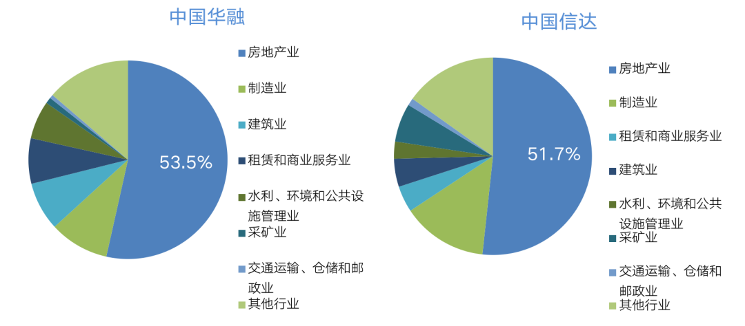 重組類不良資產中房地產占比過半,根據已上市的中國華融和中國信達的財報數據,截至2020年上半年,若收購重組類不良資產按行業分類,涉房地產類占比分別為53.5%和51.7%。