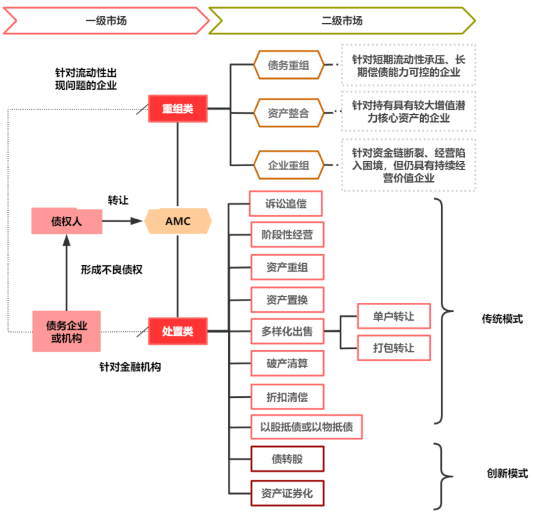 AMC的不良資產處置模式主要分為收購處置類業務和收購重組類業務。其中,涉房類不良資產以信托貸款、委托貸款和各類應收賬款的債權資產為主,歸屬于重組類業務。