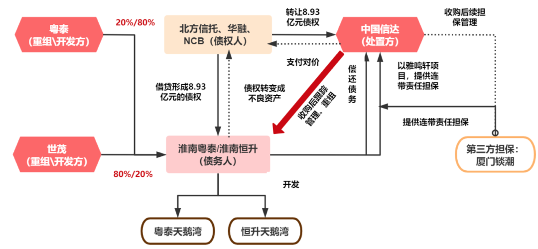 以信達收購粵泰天鵝灣和恒升天鵝灣合計8.93億債權為例。2019年6月,世茂耗資63.97億元收購粵泰資產包,世茂牽頭引入信達負責債務重組,而項目股權、開發和操盤上不發生變更,依舊由世茂和粵泰共同持股、聯合開發。