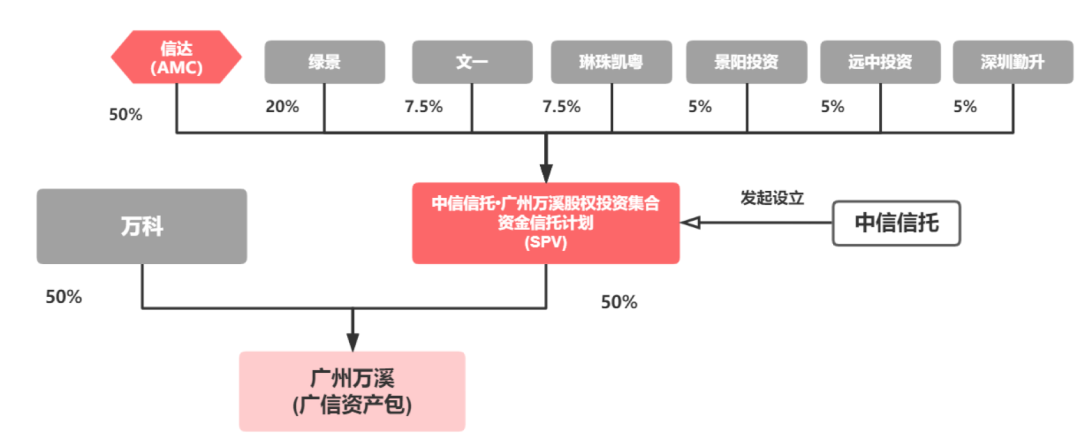 2020年6月萬科發布《關于廣信資產包引入戰略合作的公告》,采用“股權+債權”的交易方式,將廣信資產包以8.33折(390.4/470.4)出讓50%的權益予以信達在內的七位戰投,整體回籠資金390.4億元。交易完成后,萬科和綠景負責廣信資產包的整理與開發,其他五位戰投充當財務投資者。而信達收購廣信資產包25%的權益,將進行債務重組、追加投資來盤活不良資產,同時作為戰投提供資金的同時,能按照股權比例獲得相應的經營收益。