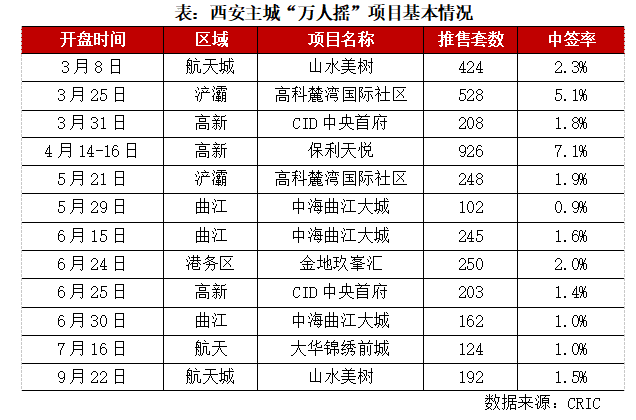 截至9月末,西安樓市出現(xiàn)12次“萬人搖”,中海曲江大城獨(dú)攬三次,高科麓灣國際社區(qū)、CID中央首府、山水美樹均兩次上榜。人氣最高的當(dāng)屬航天城山水美樹項(xiàng)目,共計(jì)獲得2.3萬組意向登記,超1.8萬人核驗(yàn)通過參與搖號(hào),瓜分區(qū)區(qū)424套房源。5月29日開盤的中海曲江大城中簽難度最高,102套房源吸引近1.2萬人搖號(hào),中簽率不足1%。