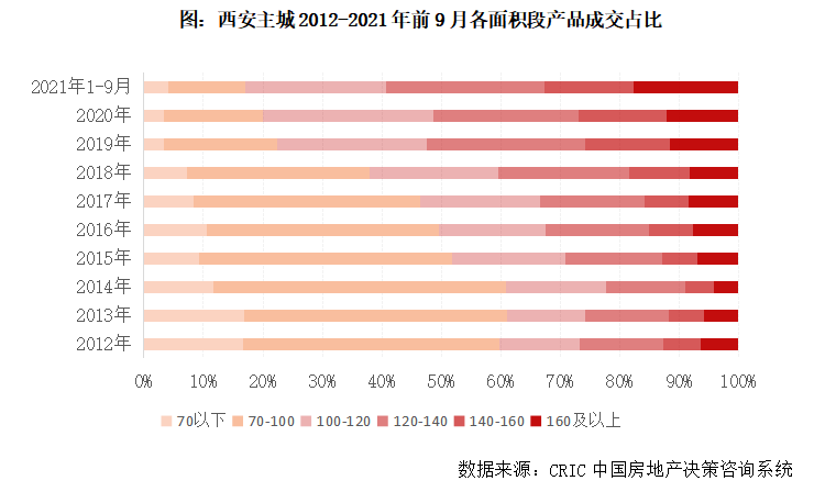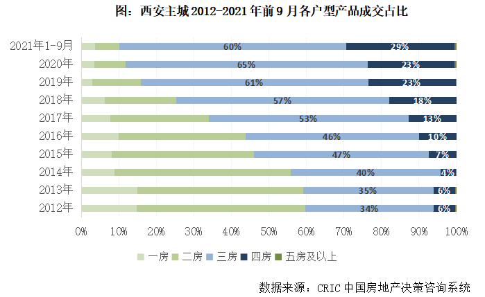 不難發(fā)現(xiàn),西安三房、四房產(chǎn)品成交占比逐年提升,并逐漸占據(jù)絕對主導(dǎo)地位。2015年,三房成交占比首度超過二房,2017年,三房成交占比突破50%,此后穩(wěn)步提升至六成以上。2016年,四房成交占比首次超過10%,到2021年前9月,比重已接近三成。反觀二房產(chǎn)品日漸邊緣化,成交占比由2015年的38%降至2021年的6%。