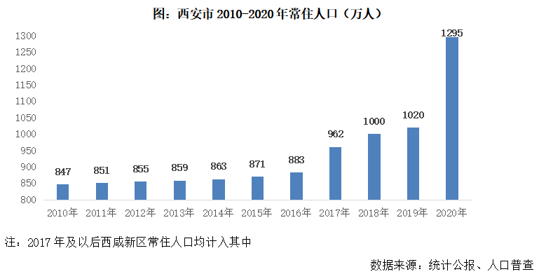 常住人口數(shù)據(jù)同樣可以印證這一結(jié)論,“七普”結(jié)果顯示,截至2020年,西安全市常住人口總量達(dá)到1295萬人,較“六普”增加448萬,剔除西咸新區(qū)行政區(qū)劃調(diào)整對人口的影響,十年常住人口增量也超過300萬人。結(jié)合統(tǒng)計(jì)年鑒公布的抽樣調(diào)查數(shù)據(jù)來看,常住人口流入主要集中在2017-2020年,前6年年均常住人口增量僅在4萬人左右。