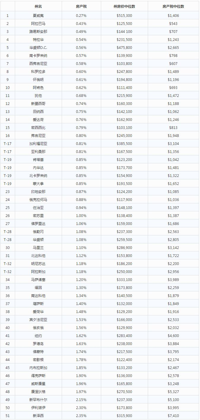 各州稅率不同,集中在0.27%~2.35%之間。事實上,美國房產稅雖然不低,但絕沒有大家想象的高。2017年美國政府全美普查數據顯示,當年美國家庭房產稅支出中位數為2149美元,而當年美國家庭收入中位數61372美元。房產稅只占家庭收入的3.5%。