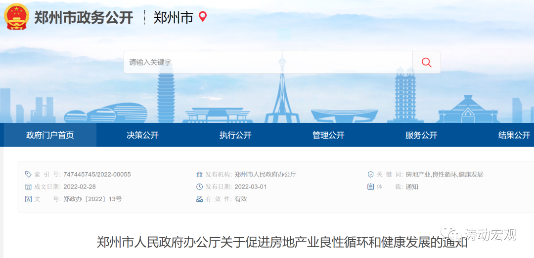 (一)2022年3月1日,鄭州市政府官網發布《關于促進房地產業良性循環和健康發展的通知》(鄭政辦(2022)13號),這是首個以政府名義發布且沒有一日游的地產行業政策文件,也是首個在限購限售等方面全面系統性松綁樓市的省會城市和限購城市。