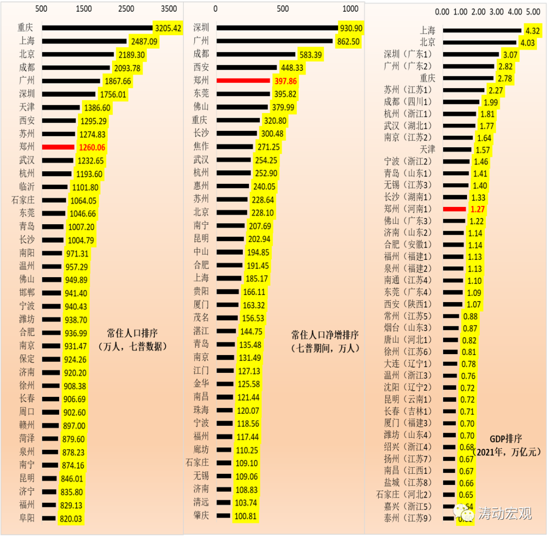1、根據七普數據(詳情參見七普人口數據揭示出哪些重要信息?),鄭州地區的常住人口數量達到1260.06萬人,屬于千萬級人口特大城市(城區人口超過1000萬為超大城市、城區人口位于500-1000萬為特大城市),在全部城市(含直轄市 )中位居第十位(排在前面的依次為重慶、上海、北京、成都、廣州、深圳、天津、西安和蘇州等地),在省會城市中位居第第三(僅低于成都、廣州與西安)。若按照七普期間的常住人口凈增情況來看,鄭州在全國所有城市(含直轄市)中位居第5,即七普期間常住人口凈增397.86萬人,僅低于深圳的930.90萬人、廣州的862.50萬人、成都的583.39萬人以及西安的448.33萬人,成為河南地區人口的蓄水池。