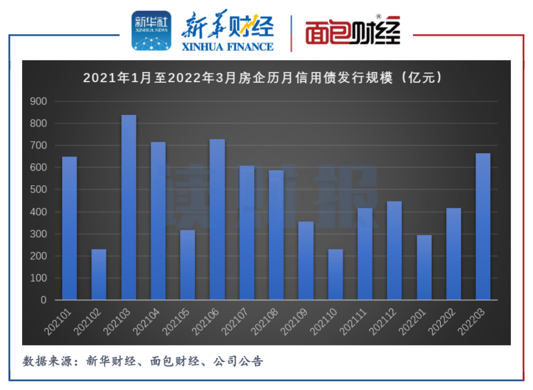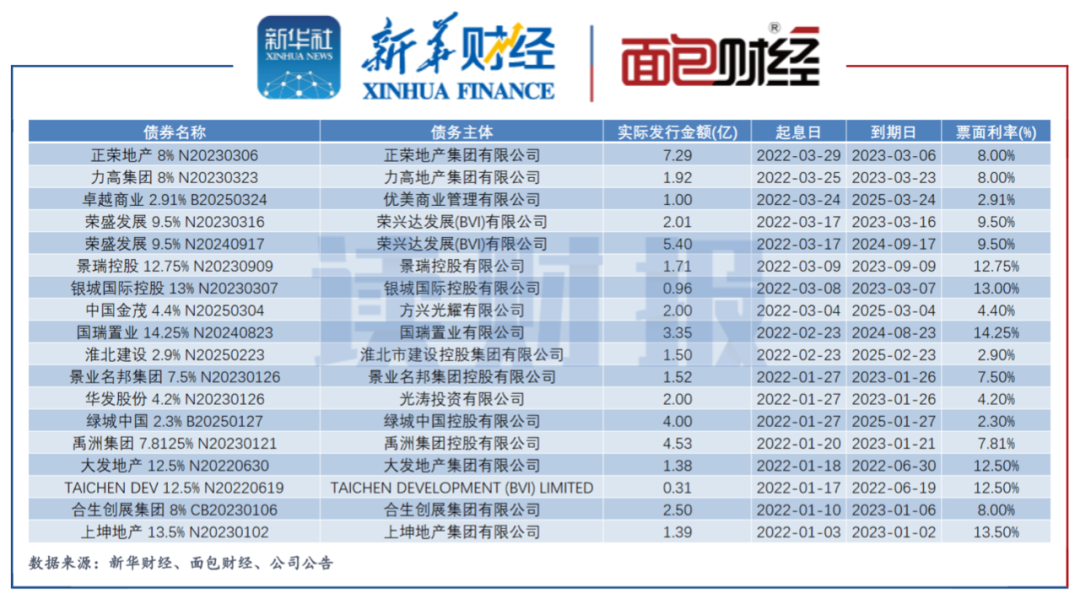 新華財經和面包財經研究員統計了房地產開發企業2022年一季度境內信用債和境外美元債的發行情況。