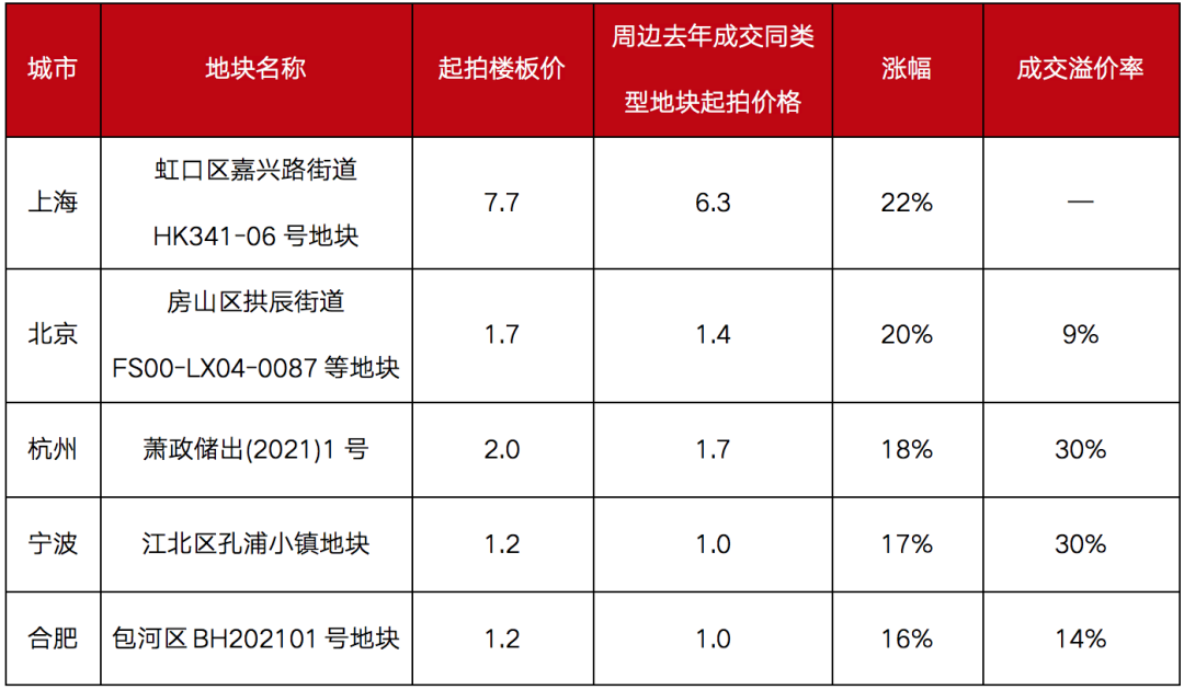 以北京為例,在2021年1月出讓的5宗涉宅用地,有3宗以上限價成交,其中上限溢價率最高的大興舊宮地塊,成交溢價率僅為10.88%,而此前北京的溢價率上限多在50%左右。