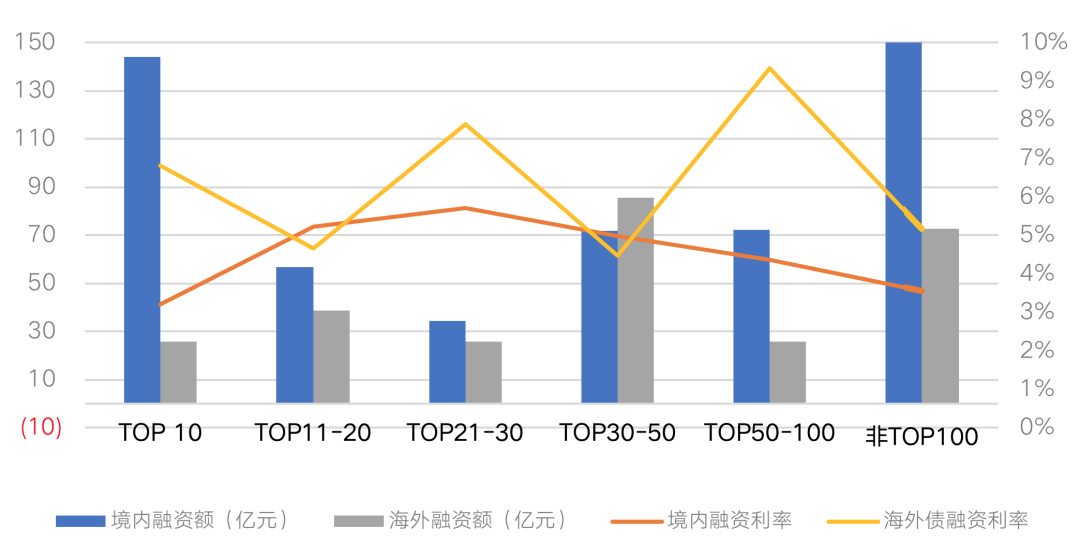 從企業規模來看,國內各梯隊房企境內發債成本相差不大,均在5%上下,其中,TOP10和非TOP100房企發債成本最低,TOP10龍頭房企僅為3.21%,而非TOP100房企中可以成功發行債券的9成為國企背景,寬貨幣緊信用的態勢凸顯,資金仍有濃厚的避險情緒。海外債方面,以TOP50-100房企海外發債融資成本最高,對于這些國內發債艱難的房企來說,出海高息發債也是一個不得已的選擇。