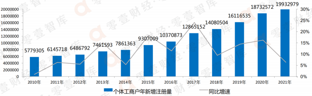 圖 1:2010-2021年我國個體工商戶新增數量規模與增速(單位:戶、%)