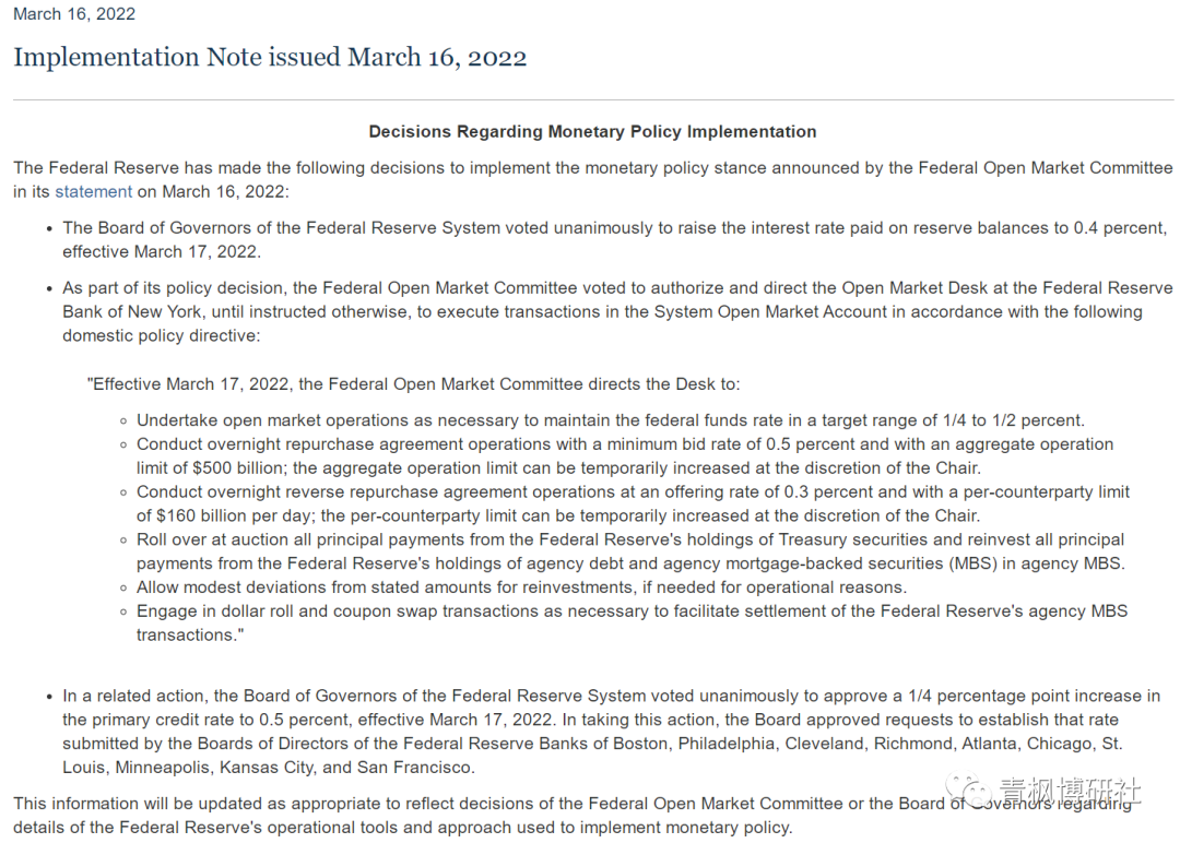 1、本輪議息會議將聯邦基金利率目標區間上調25BP至0.25-0.50%,同時將隔離回購與逆回購利率、初級信貸利率以及超額準備金利率均上調25BP至0.50%、0.30%、0.50%和0.40%。
