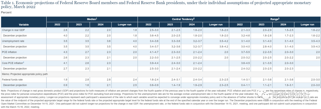 2、大幅上調了對通脹率的預測,如將2022-204年的通脹率分別由2.6%、2.3%、2.1%上調至4.3%、2.7%和2.3%,將核心通脹率分別由2.7%、2.3%、2.1%上調至4.1%、2.6%和2.3%。可以看出,對2022年的通脹率上調幅度最大。