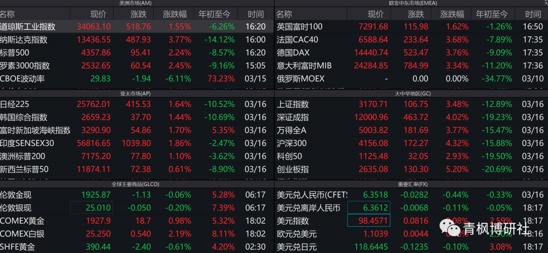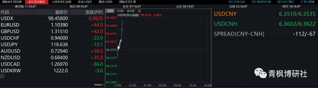 雖然全年加息次數較2021年12月的預期有所上升,但考慮到對經濟基本面的判斷更加保守,美聯儲加息更多是基于通脹考慮,以及此次美聯儲加息25BP而非50BP等因素,目前看市場的反應還是比較積極。具體看,美國三大股指均明顯上揚,美元指數跌0.62%報98.3755、創兩周新低且非美貨幣多數上漲(如歐元兌美元漲0.37%報1.0995、英鎊兌美元漲0.51%報1.3109、澳元兌美元漲0.93%報0.7256、美元兌日元漲0.4%報118.768、美元兌加元跌0.25%報1.2732、美元兌瑞郎漲0.09%報0.9423以及離岸人民幣兌美元漲135個基點報6.368)。