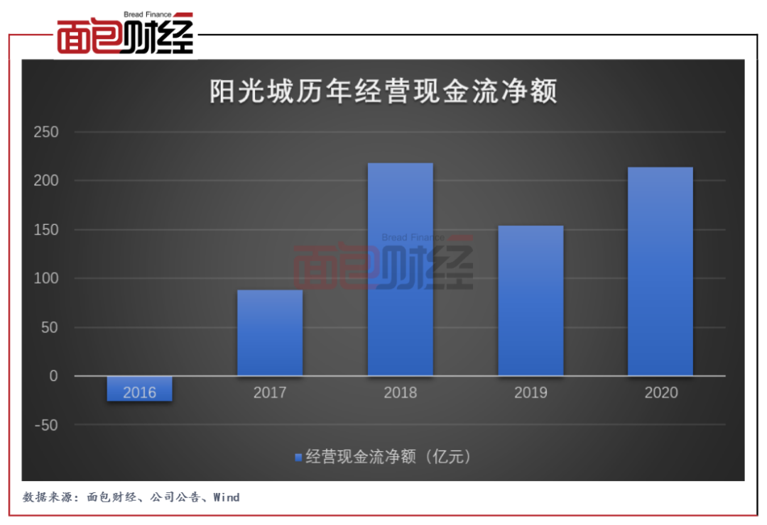 現金流方面,陽光城2020年產生經營性凈現金流入213.54億元,相比2019年的153.96億元明顯增加。截至2020年末,公司賬面擁有貨幣資金498.05億元。