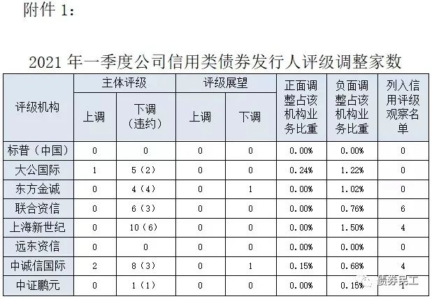 根據中國證券業協會和中國銀行間市場交易商協會于2021年6月 2日公布的《2021年第一季度債券市場信用評級機構業務運行及合規情況通報》,整個一季度主體信用評級正面調整的只有3家,同比減少78.57%!其中大公國際上調1家,中誠信國際上調2家,其他評級公司均無上調記錄,主體信用評級提升的難度真的不是一般的大了!