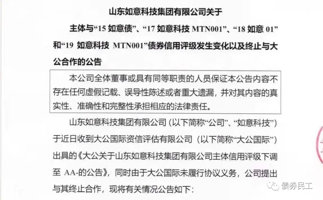 根據山東如意科技集團有限公司(以下簡稱“如意集團”)2021年5月31日的公告,自公司2020年3月16日終止與大公國際的評級合作之后,公司與評級機構全部溝通完畢,沒有評級公司與公司開展評級合作。這在信用債券市場上也是很少見的了,畢竟多數債券都需要披露跟蹤評級報告。