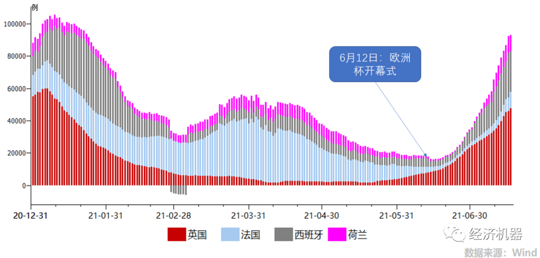 過去半年,海外疫情出現反復,印度等局部“淪陷”此起彼伏。但市場情緒整體平穩,一個隱含的假設是,隨著疫苗接種持續推進,疫情最終會得到控制。但近期,受Delta病毒及美/歐洲杯的影響,一些疫苗接種率高的發達國家,新增感染人數再次猛烈反彈。下圖1顯示,歐洲杯開幕后,幾個足球強國感染人數飆升,而這幾個國家的接種率大都超過了100%,接近群體免疫標準(120%)。