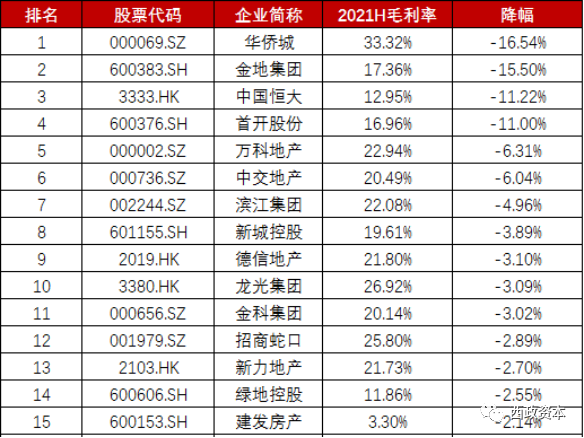 房企2021年以前的毛利率一般為20-40%,2021年開始將逐步走低并企穩,地產投資機構通過對房企的毛利率進行橫向或縱向的對比及構成分析,是毛利率分析的主要方法。但需注意,由于毛利率是靜態指標,部分注重高周轉的房企毛利率就會相對較低,利用房企毛利率評價房企時,需結合整體評價,否則容易脫離房企實際盈利能力,另外香港上市房企和大陸上市房企適用的法律體系略有差異,所以對比分析時盡量選擇相同地域的房企。下圖是2021年上半年部分房企的毛利率指標。